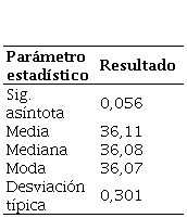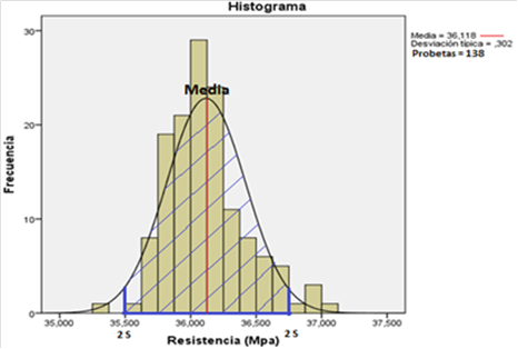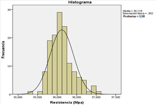Después de eliminar el 13,09 % de datos atípicos, los registros de resistencia a la compresión cumplían con el supuesto de normalidad (p = 0,056). Esta estimación permite afirmar, con un nivel de confianza del 95 %, que, al seleccionar un adoquín al azar, su resistencia a la compresión se encontrará dentro del intervalo comprendido entre 36,12 MPa ± 2·0,301 MPa, es decir, entre 35,51 MPa y 36,72 MPa.