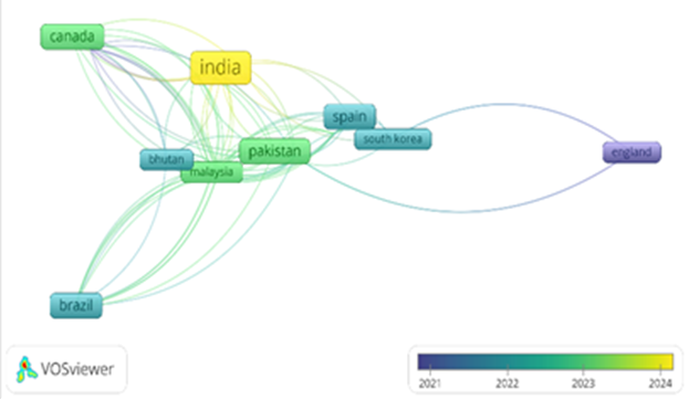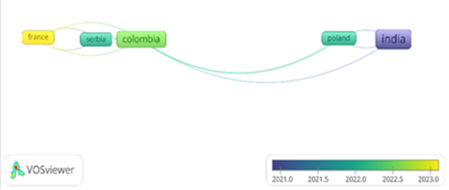 Las Figuras 1 y 2 presentan los mapas bibliográficos creados con VOSviewer para adoquines de concreto que utilizan material reciclado, basados en los datos indexados en Web of Science y Scopus. Estos mapas ofrecen la posibilidad de observar cómo se relacionan los países que utilizan fuentes comunes, así como la interacción entre naciones y la presencia de términos relevantes en los artículos científicos analizados. El color de los nodos refleja la actualidad de las publicaciones, en función del tiempo, mientras que el grosor de las conexiones indica la fuerza de la relación bibliográfica entre los países. Esta representación gráfica ayuda a identificar las áreas geográficas donde se concentra la producción y la colaboración científica en los dos temas de investigación durante el periodo 2020 –2025.