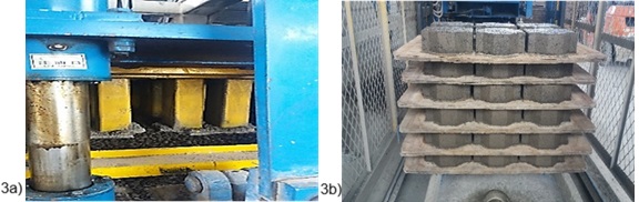 Se fabricaron adoquines de hormigón tipo A con un espesor de 8 cm. La mezcla de concreto, una vez preparada, fue transportada mediante una cinta automática hacia una tolva de alimentación. Durante este proceso, un equipo dosificador distribuyó el material de manera uniforme sobre los moldes de acero, asegurando una colocación consistente y controlada. Luego, se utilizó una presión vibratoria de 32 MPa durante cerca de 15 segundos con una prensa industrial (Figura 3a) para conseguir una buena compactación, eliminar burbujas de aire y reducir vacíos que pudieran afectar la resistencia mecánica y la durabilidad de los adoquines.