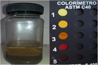 Colorimetría del Agregado Fino. En la presente investigación, la identificación de impurezas orgánicas se realizó de acuerdo con los estándares fijados en las normativas INEN 855 [36], ASTM C40 [37]. El propósito fundamental de esta fase fue evaluar la idoneidad del agregado fino convencional utilizado en la producción de adoquines de concreto, a través de un análisis que permitiera identificar la ausencia de compuestos orgánicos u otras contaminaciones que pudieran poner en riesgo la durabilidad, la resistencia mecánica y la calidad general del producto terminado.