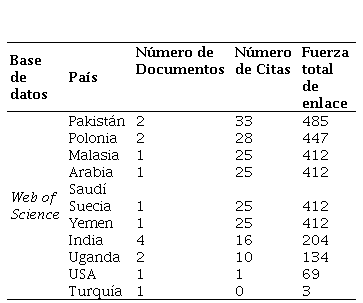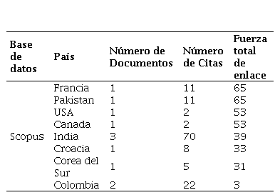 Las Tablas 1 y 2 organizan de manera clara los documentos recolectados, categorizados según el sistema de base de datos, el país, el número de documentos, la cantidad de citas y la fuerza total de enlace Total Link Strength (TLS). Este indicador mide el nivel y la fuerza de la colaboración entre autores, instituciones o naciones en el ámbito de la ciencia [22]. Su uso posibilita llevar a cabo análisis comparativos entre diferentes áreas geográficas y bases de datos académicas, esto permite identificar los principales centros de producción del conocimiento, así como evaluar la robustez de sus redes de colaboración científica.