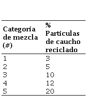 Para el estudio se crearon cinco categorías diferentes de mezcla de concreto, en las que se realizó un reemplazo parcial del agregado fino convencional con partículas de caucho reciclado, provenientes del procesamiento de neumáticos desechados. Esta técnica de sustitución fue utilizada con la finalidad de analizar el rendimiento mecánico y la viabilidad técnica de incorporar materiales reciclados en la producción de elementos de construcción. Los porcentajes exactos de reemplazo y las características de cada mezcla se describen en la Tabla 3.