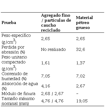 En términos de humedad, se registraron 7,05 % para el agregado fino convencional y 7,02 % para el caucho reciclado. Los valores de absorción fueron de 4,16 % (fino convencional) y 2,67 % (grueso), lo que es fundamental para el ajuste de la proporción agua/agregado. El módulo de finura fue prácticamente el mismo en ambas situaciones (2,68 y 2,67), y el máximo tamaño de las partículas se mantuvo entre 4,76 mm y 19,05 mm, dentro de los limites requeridos para pavimentos de hormigón (ver Tabla 5).