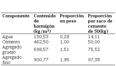 El diseño de la mezcla se realizó siguiendo el procedimiento indicado por la normativa ACI 211.1-91 [38], que establece las pautas técnicas para la elaboración de mezclas de concreto, especificando las proporciones correctas de cemento, agua, agregados finos y gruesos, por cada metro cúbico de concreto, según las características deseadas del producto final. Este enfoque ofrece un método ordenado que permite obtener una mezcla con la resistencia a la compresión necesaria, así como una buena trabajabilidad y durabilidad. Por lo tanto, es esencial realizar una caracterización previa de todos los materiales involucrados, para asegurar un rendimiento óptimo del hormigón en su estado fresco y endurecido.