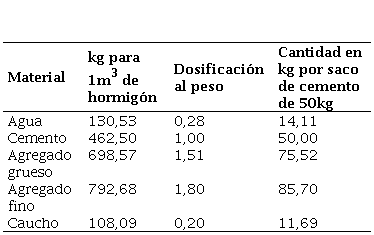 Para la mezcla modificada, se realizó un reemplazo del 12% del agregado fino por partículas de caucho reciclado. La fórmula resultó 130,53 kg de agua, 462,50 kg/m³ de cemento, 698,57 kg/m³ de agregado grueso, 792,68 kg/m³ de agregado fino y 108,09 kg/m³ de partículas de caucho reciclado (ver Tabla 7).