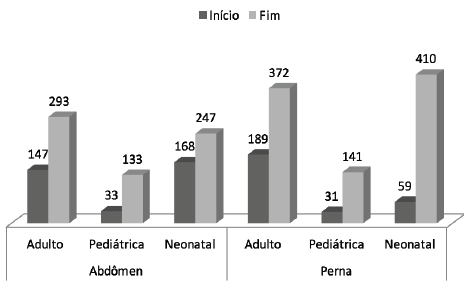 Foram coletadas 98 amostras da região da perna e abdômen de 49 uniformes, no início e fim da jornada de trabalho (Figura 1). Nesse gráfico é possível visualizar o número de colônias que cresceram nos uniformes, sendo elas separadas por região de coleta e por UTI.