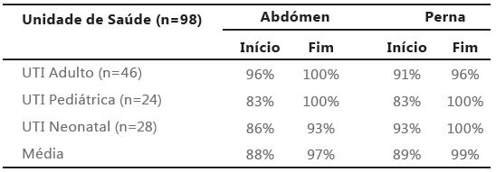 Das 98 amostras foi possível verificar a positividade de crescimento bacteriano das três UTI nos dois períodos de coleta. Observou-se que 88% das amostras iniciais obtidas da região do abdômen apresentaram positivas no início da jornada de trabalho aumentando para 97% no final. Na região da perna a média inicial foi de 89% de amostras com crescimento bacteriano e no final 99%. Esses dados não levam em conta a quantidade de colônias bacterianas que cresceram e sim a presença ou não de bactérias nas amostras (Tabela1).