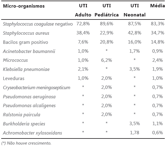 A identificação microbiológica demonstrou a presença de diferentes microrganismos, dos quais os principais representantes encontrados foram os Staphylococcus coagulase negativo, Staphylococcus aureus e Bacillus sp (Tabela 2).