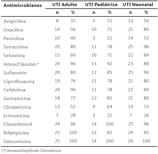 Nas três UTI o segundo microrganismo mais frequente foi o Staphylococcus aureus, representado por uma média de 34,7% das amostras, dos quais foi analisado o perfil de sensibilidade devido a sua importância no perfil epidemiológico de processos patológicos. Em relação ao perfil de sensibilidade das cepas de S. aureus, 56% na UTI adulto, 80% na UTI neonatal, e 71% na UTI pediátrica eram sensíveis à oxacilina. 100% das amostras testadas foram sensíveis à vancomicina.
