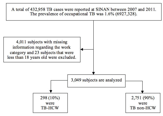 The study population included TB cases reported in Brazil between January 1, 2007 and December 31, 2011 whose occupational status of TB transmission was defined as TB acquired at the workplace. Subjects younger than eighteen years old or with missing information in the work category were excluded.