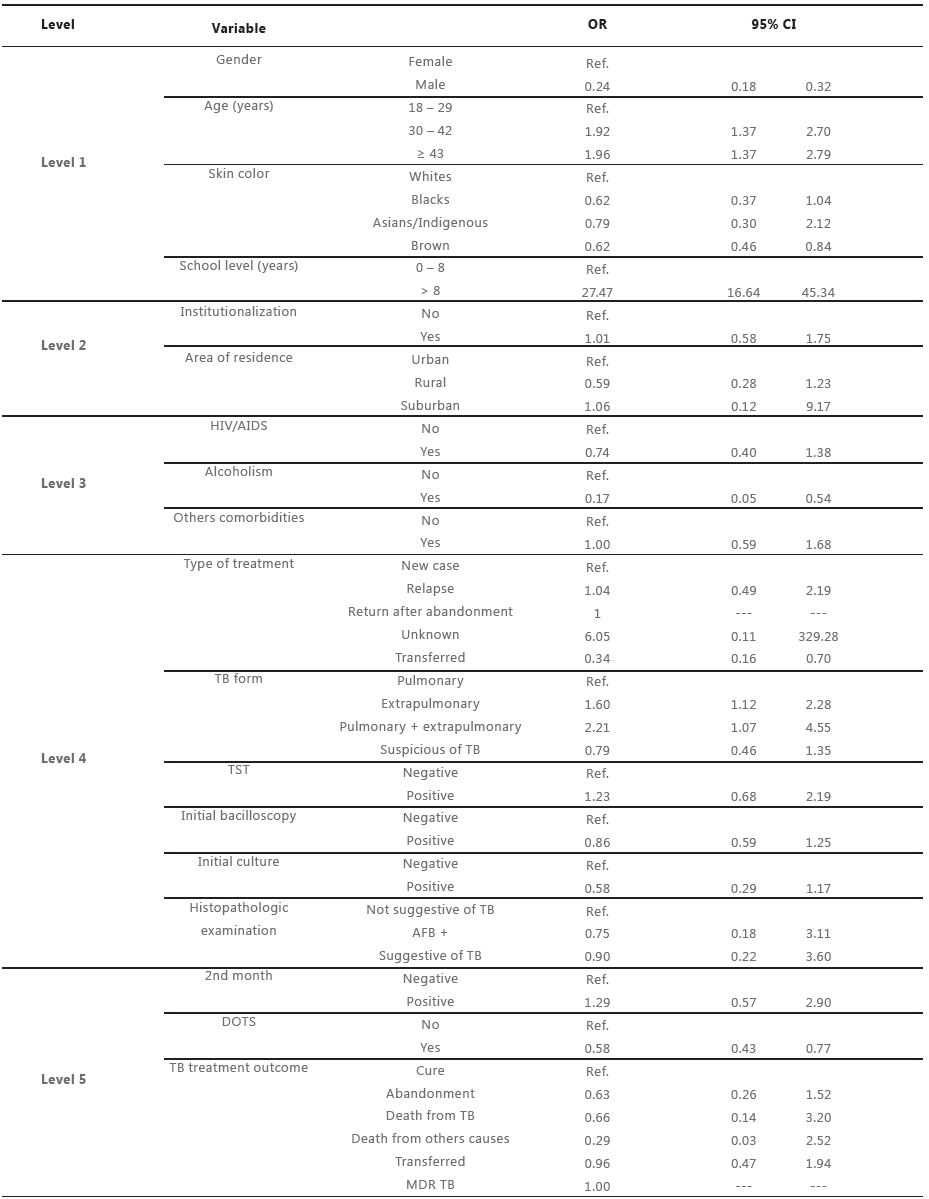 To address the interrelationships of the conceptual framework of TB determinants, the covariates were grouped into a hierarchy of categories, ranging from distal determinants to proximate ones.17,18 Level 1 included socioeconomic characteristics (age plus years of education plus skin color), level 2 variables evaluated the environmental characteristics (variables retained from step 1 plus institutionalization plus area of residence), level 3 variables were related to health conditions associated (variables retained from step 2 plus HIV/AIDS plus alcoholism plus other comorbidities), level 4 variables assessed TB features (variables retained from step 3 plus type of treatment plus TB form plus TST plus initial smear plus initial culture plus histopathologic examination) and level 5 variables were TB outcome/care (variables retained from step 4 plus 2nd month smear plus DOTS plus TB treatment outcome). In each level, the covariates that were associated with the outcome (p ≤ 0.10) were retained in the model. Thus, the covariates were evaluated after adjustment for confounders in the same set or in hierarchically superior sets. This approach allowed researchers to quantify the contribution of each level of adjustment, to understand the model building strategy as well as to interpret the independent associations.18 The results were displayed as odds ratios (OR) and 95% confidence intervals (95% CI). These analyses were performed using Stata, version 12.0.