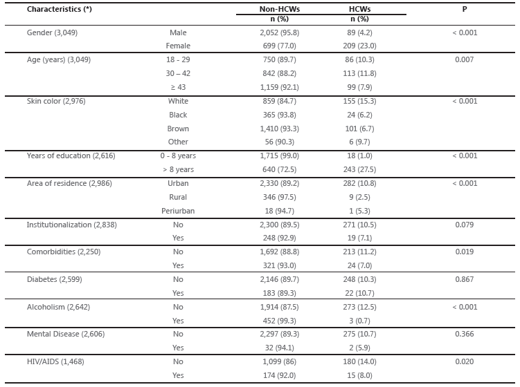 Men were more prevalent in the non-HCW group (p< 0.001), comprising 2,052 (95.8%) cases. Differences in age groups was significant between the non-HCW compared to the HCW group (mean age ≥ 43 years) (p= 0.007). Subjects identified as black were more prevalent in the non-HCW group (93.8%) when compared to the HCW group (6.2%), (p< 0.001). The proportion of subjects with less than eight years of education was higher among the non-HCW group (99%) than the HCW group (1%), (p<0.001). Subjects identified as residents of rural areas were more prevalent in the non-HCW group (97.5%) than in the HCW group [(2.5%) (p< 0.001)]. Comorbidities were more prevalent in the non-HCW group (93%) when compared to the HCW group (7%) (p= 0.019), and alcoholism was greater in the non-HCW group (99.3%) when compared to the HCW (0.7%), (p< 0.001). Among those 189 who were HIV / AIDS, most were non-HCW [92.0% (p=0.020)].