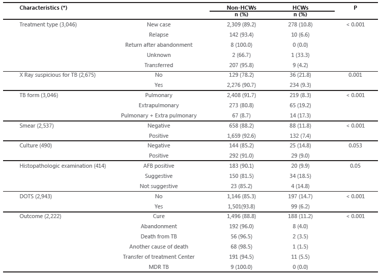 Table 2 describes the study subjects according to the characteristics of TB presentation. Relapse was higher in the non-HCW group (6.6% HCW vs. 93.4% no-HCW p < 0.001). The presence of X-ray results that were suggestive of TB was found in 21.8% of the HCW and 78.2% of the non-HCW (p < 0.001). The prevalence of pulmonary TB was higher among non-HCW (91.7% vs. 8.3%, p < 0.001); similarly, positive smear test results were also higher among non-HCW (92.6% vs. 7.4%, p < 0.001).