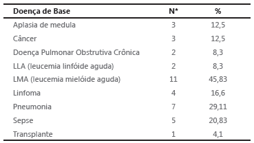 Entre as doenças de base descritas pelos pacientes analisados, a leucemia mielóide aguda (LMA) foi a mais prevalente, observada em 11 (45,8%) casos. Outras doenças hematológicas como (i) linfoma, (ii) aplasia de medula e (iii) leucemia linfóide aguda também foram observadas em nove (37,5 %) pacientes, conforme demonstrado na Tabela 1. Associada às doenças de base, a neutropenia foi a pré-condição mais prevalente, presente em 23 (95,8%) dos pacientes, seguido do uso de quimioterápicos por 19 (79,16%) e do uso de corticosteroides em 18 (75%) casos.
