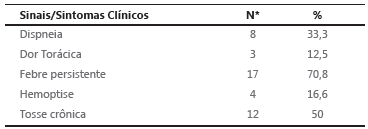 Os achados clínicos mais prevalentes foram a (i) febre persistente (por mais de uma semana), em 17 (70,8%) pacientes, e (ii) tosse crônica, em 12 (50 %) pacientes (Tabela 2). Em relação à realização de procedimentos invasivos que facilitariam a contaminação por Aspergillus, 13 (54,1 %) pacientes relataram uso de cateter venoso central (CVC) e quatro (16,6 %) o uso de ventilação mecânica. Somado a estas características clínicas, a análise de imagens radiológicas pulmonares demonstrou que oito (33,3%) pacientes apresentaram derrame pleural, sete (29,11%) consolidação pulmonar e cinco (20,83 %) opacidade em vidro fosco.