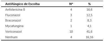 Em relação ao uso de antifúngicos durante o período de suspeita de infecção por Aspergillus, 20 (83,33 %) pacientes os utilizaram de modo empírico. O antifúngico voriconazol foi administrado na maioria dos casos, para 10 (41,6%) pacientes, enquanto anfotericina B, para quatro (16,6 %) (Tabela 3). Além do uso de antifúngicos, todos os pacientes analisados fizeram uso de pelo menos um antibiótico de amplo espectro. A associação de cefepime com vancomicina foi escolhida para 14(58,3 %) pacientes, seguido da piperacilina/tazobactam, utilizada por 50 % dos indivíduos.