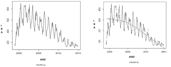 Em Rondonópolis-MT observam-se que os casos de IRA vêm apresentando uma redução ao longo destes dezesseis anos de análise (Figuras 1a e 1b). Esta redução foi de 4073 casos em 1999 para 1637 em 2014.