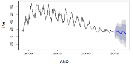 Uma vez ajustado o modelo SARIMA aos dados, foi efetivado o modelo de previsão, notando que houve redução no comportamento dos casos ao longo dos anos de análise. Neste sentido, é relevante destacar que no modelo de previsão para 2015 e 2016, elucidado na Figura 2, ressalva-se que há tendência para diminuição dos casos de IRA em crianças menores de dois anos em Rondonópolis-MT diagnosticados na atenção primária à saúde, corroborando com o que vem acontecendo nos últimos anos.