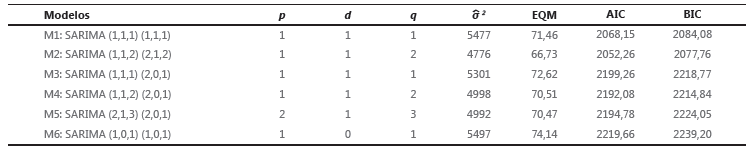 Dando sequência às análises, pode-se observar o ajuste de alguns modelos para os casos de IRA em Rondonópolis-MT (Tabela 1). Nesta Tabela, nota-se que o potencial do modelo SARIMA identificado são o AR(1), D(1) e MA(2), ou seja, com parâmetros p=1, d=1 e q=2. Sendo assim, o modelo que melhor representa a série de IRA é um SARIMA (1, 1, 2), equivalente a um modelo ARIMA (1, 1, 2) com sazonalidade (2, 1, 2), pois ele apresenta o menor valor de AIC e BIC entre os modelos concorrentes aos casos de IRA, conforme destaque na Tabela 1.