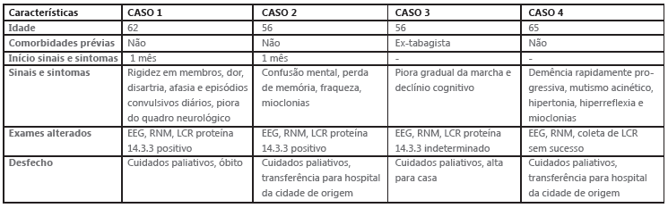 Caso 1, paciente apresentou queixa de dor e rigidez em membro superior direito súbito um mês, piora progressiva e acometimento do membro inferior direito. Procurou atendimento, internada apresentou disartria, afasia e episódios convulsivos diários. Transferida para hospital de referência com piora, rigidez de hemicorpo esquerdo, suspeita de meningoencefalite. Após 15 dias evoluiu com insuficiência respiratória e rebaixamento de sensório, encaminhada para UTI com suspeita de doença priônica. EEG alterado e LCR positivo para proteína 14.3.3. Estabelecidos cuidados paliativos, óbito ocorreu três meses após sintomas.