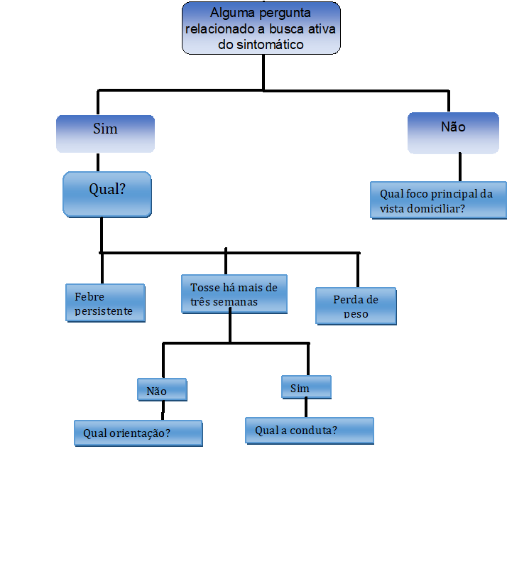 A coleta de dados foi realizada em dois momentos, o primeiro por meio do acompanhamento do ACS durante as VD, totalizando 57 visitas. Utilizou-se observação participativa com foco no tipo de abordagem que o ACS realizava na VD. Essa observação foi por meio de um fluxograma, o mesmo foi constituído por observação de alguma pergunta relacionada ao SR (tosse, febre ou perda de peso) pelo ACS, conforme a figura 1.