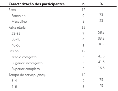 Para caracterização dos participantes foi analisado o perfil sociodemográfico com informações que julgamos ter relação com o processo de atuação desses profissionais. Tais informações foram obtidas através das entrevistas, as quais foram agrupadas permitindo elaborar o perfil dos participantes, relacionado ao sexo, idade, escolaridade e tempo de serviço. Esses elementos estão expressos no quadro abaixo.