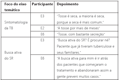 Em relação ao conhecimento sobre a sintomatologia da TB, os ACSs identificaram a tosse como principal sintoma, porém ainda tem ACS que demonstra certa insegurança sobre as caraterísticas da tosse, se era seca ou com secreção, além do período da tosse, pois teve participante que afirmou que o período da tosse teria que ser por mais de meses, fazendo associação com a febre, para poder chegar a suspeita de TB, elucidado no quadro 1 no foco do eixo temático de sintomantologia da TB