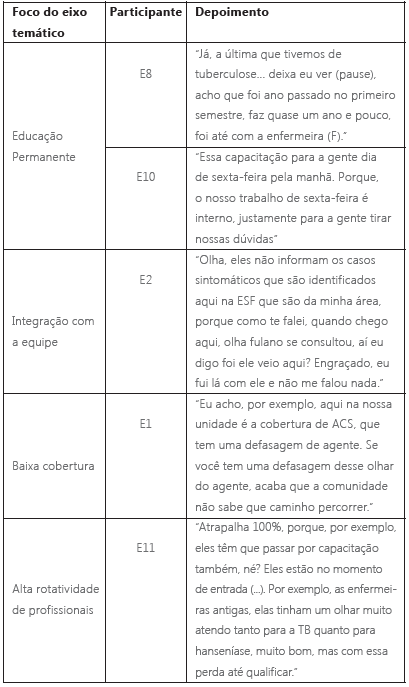Os ACSs elencaram algumas barreiras que dificultam o controle da TB, entre elas, a falta da continuidade de capacitações, pois segundo os participantes tinham mais de um ano que não recebiam nenhum tipo de treinamento a respeito da temática, e que seria de extrema importância para a atualização, conforme o eixo temático eixo capacitação permanente no quadro 2.