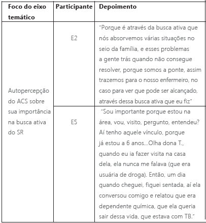 Existe o entendimento por parte dos ACSs entrevistados, que o mesmo é a ponte entre comunidade e a ESF, desta forma, reconhece a necessidade a partir dos problemas encontrados. Esse método para busca ativa do SR é essencial, pois a TB é uma patologia circundada por diversos determinantes sociais, sendo que esses determinantes são relacionados às condições socioeconômicas e culturais. Podendo ser evidenciado com depoimentos do quadro 4.