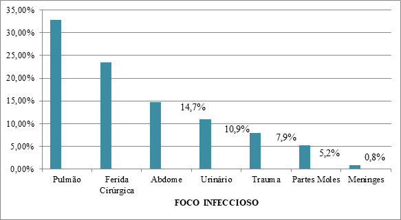 Dentre as intervenções primárias no tratamento da sepse, as diretrizes destacam a identificação precoce do sítio infeccioso, já que esse fato é de extrema importância para a determinação da conduta terapêutica. Notou-se, na presente pesquisa, o predomínio da fonte de infecção pulmonar (32,9%), seguido da ferida cirúrgica (23,5%) e do abdômen (14,7%). O foco pulmonar prevalente pode ser reflexo do fato de que a maioria da população pesquisada foi composta por idosos com doenças de base que normalmente apresentam um risco maior de infecção respiratória.15Em pacientes idosos que possuem comorbidades é possível evidenciar a diminuição da resposta imune e do mecanismo de proteção das vias aéreas, o que influencia na alteração do nível de consciência e/ou reflexo de deglutição, aumentando o risco de pneumonia bacteriana. Os altos índices de infecção do sítio pulmonar é compatível ao aumento de pacientes que necessitam de ventilação mecânica. A análise do perfil clínico dos pacientes com sepse admitidos na UTI de um hospital público de Fortaleza revelou dados que se assemelham à pesquisa, cujo foco pulmonar prevaleceu em 82,6% dos casos, seguido da ferida cirúrgica com 37,0% e abdominal 10,9%.23