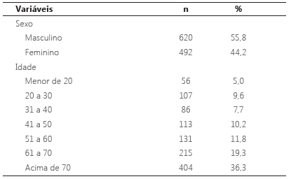De um total de 1.557 prontuários de pacientes admitidos entre janeiro de 2012 a janeiro de 2017 na UTI adulto, 1.112 (71,4%) foram incluídos na pesquisa. Destes, 620 (55,8%) eram do sexo masculino, 36,3 % eram idosos com idade superior a 70 anos, conforme descrito na Tabela 1.