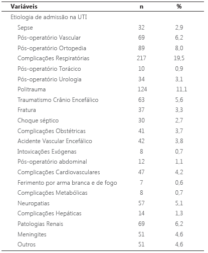 Como causa de admissão na UTI, houve prevalência das complicações respiratórias (19,5%). Estes dados estão de acordo com aqueles descritos em estudo realizado em São Paulo12. O que evidencia que cada vez mais o sítio pulmonar tem sido implicado na fonte do processo infeccioso e que o uso da ventilação mecânica é indispensável.12