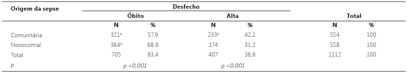 Com referência a origem da sepse e o desfecho, houve predominância na origem nosocomial (50,2%), sendo que destes 384 (34,5%) foram a óbito e 174 (15,6%) receberam alta. Nos casos de origem comunitária, de um total de 554 (49,8%) pacientes, 321 (28,8%) foram a óbito e 233 (20,9%) receberam alta. A infecção nosocomial tem associação significativa com o óbito (p<0,001), assim como a associação entre a infecção comunitária e a possibilidade de alta hospitalar (p<0,001) (Tabela 3).