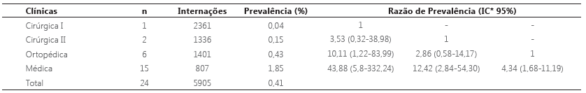A prevalência de pacientes internados com LPP nas clínicas avaliadas está listada na tabela 1, em que é possível observar o maior percentual na Clínica Médica. Os resultados do cálculo da RP, tomando como referência o percentual da Clínica Cirúrgica I, demonstraram que não houve diferença estatística entre Clínicas Cirúrgicas I e II (optando assim por analisá-las conjuntamente nos demais resultados da pesquisa). As clínicas Ortopédica e Médica revelaram uma prevalência de pacientes com LPP consideravelmente maiores, o que demonstra que, entre si, ambas são estatisticamente diferentes, contudo, somente a Clínica Médica manteve significância estatística em todas as correlações.