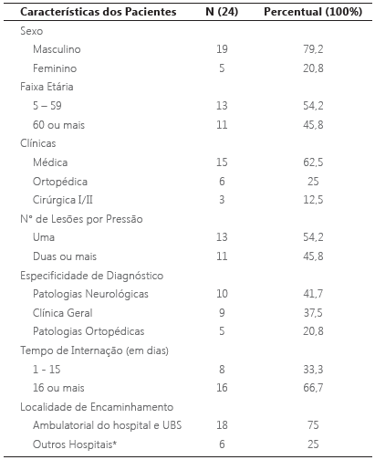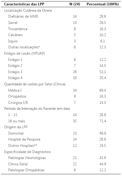 Foram internados, durante o período do estudo, um total de 5.905 pacientes nas clínicas avaliadas, onde 24 (0,41%) indivíduos apresentaram lesões por pressão, totalizando 49 LPP. Da amostra total de pacientes com LPP, 6 (25%) encontravam-se internados na Clínica Ortopédica, 3 (12,5%) nas Clínicas Cirúrgicas I/II e 15 (62,5%) na Clínica Médica.