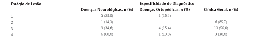 Conforme a tabela 4, houve indivíduos com doenças neurológicas com lesões em todos os estágios, e nestas doenças se observou as maiores proporções no grau 1 (83,3%) e 4 (60,0%). A clínica geral concentrou as maiores proporções de lesões grau 2 e 3. Tais diferenças foram estatisticamente significativas (p=0,047), indicando associação entre o estágio da LPP e a especificidade do diagnóstico na amostra.