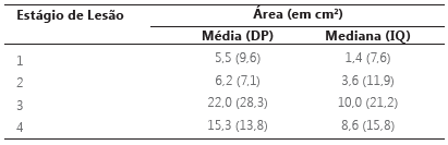 Foram encontradas diferença estatística também entre estágio da LPP e área de lesão (p=0,018). Sendo as lesões de menores medianas de áreas as de grau 1 (1,4) e 2 (11,9), e as de maiores medianas de áreas aquelas de grau 3 (21,2) e 4 (15,8) (tabela 5).