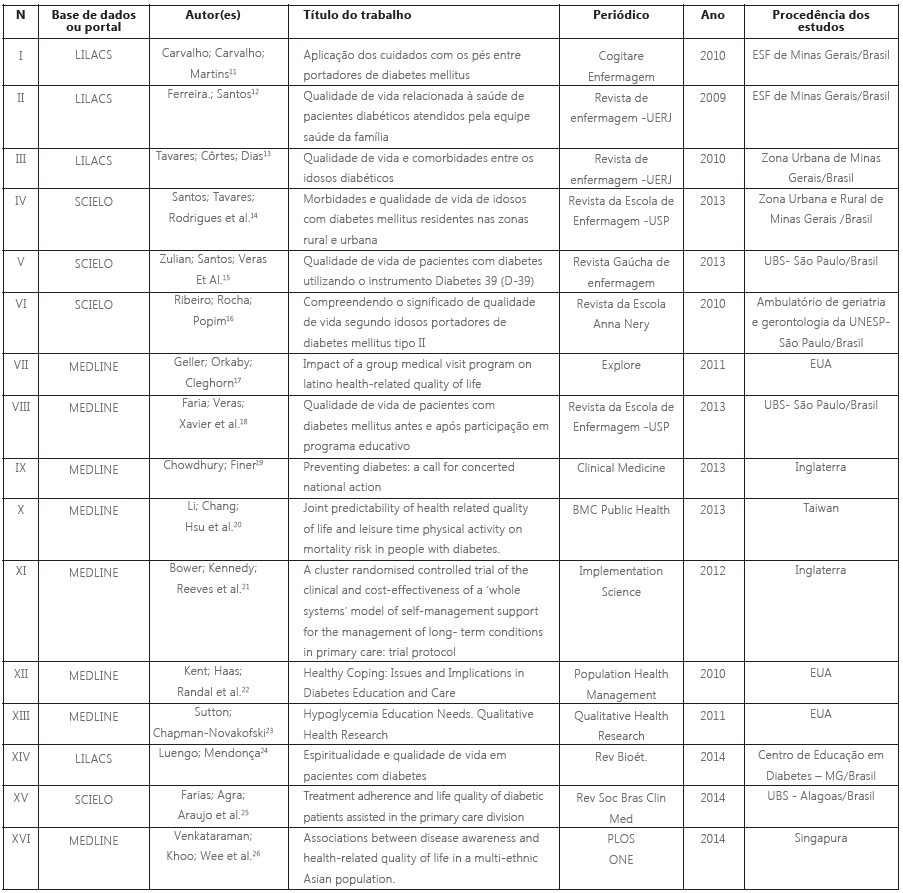 Trata-se de uma Revisão Integrativa, desenvolvida na Biblioteca Virtual de Saúde (BVS-BIREME), pelas bases de dados: Medical Literature Analysis and Retrieval System Online (MEDLINE), Literatura Latino-Americana e do Caribe em Ciências da Saúde (LILACS) e portal da Scientific Eletronic Library Online (SCIELO). Utilizou-se os descritores “diabetes mellitus. and “qualidade de vida” [Descritor de assunto], and “2009” or “2010” or “2011” or “2012” or “2013” or “2014” or “2015” [Ano de publicação] and "ESPANHOL" or "INGLES" or "PORTUGUES" [Idioma].