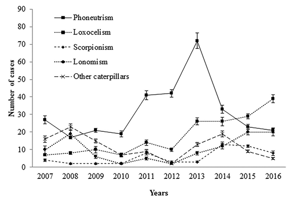 The annual number of cases of loxoscelism, scorpionism, lonomism and accidents with other species of caterpillars was constant, whereas there was a marked increase in the cases of phoneutrism, especially in 2011, 2012 and 2013 (Figure 1). It is also possible to verify a subtle increase in the number of cases of loxoscelism in 2013, which remained stable and increased again in the last year of data collection, in 2016.