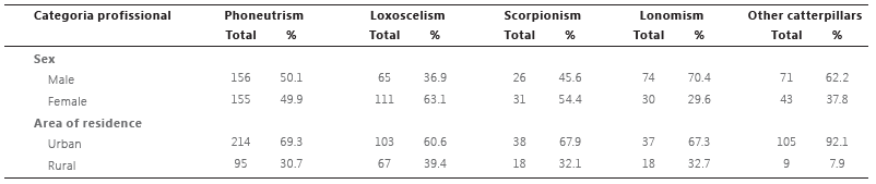 A total of 1,367 accidents with venomous arthropods in the municipality of São Miguel do Oeste. A greater frequency of lonomism and accidents with other caterpillars was observed for men. Phoneutrism and scorpionism were not different as to sex. Cases of loxoscelism occurred mainly with women (Table 1). The number of accidents was considerably higher in the urban area, for all types of accidents evaluated. There was less differentiation in the incidence between rural and urban areas for scorpionism and lonomism (Table 1).