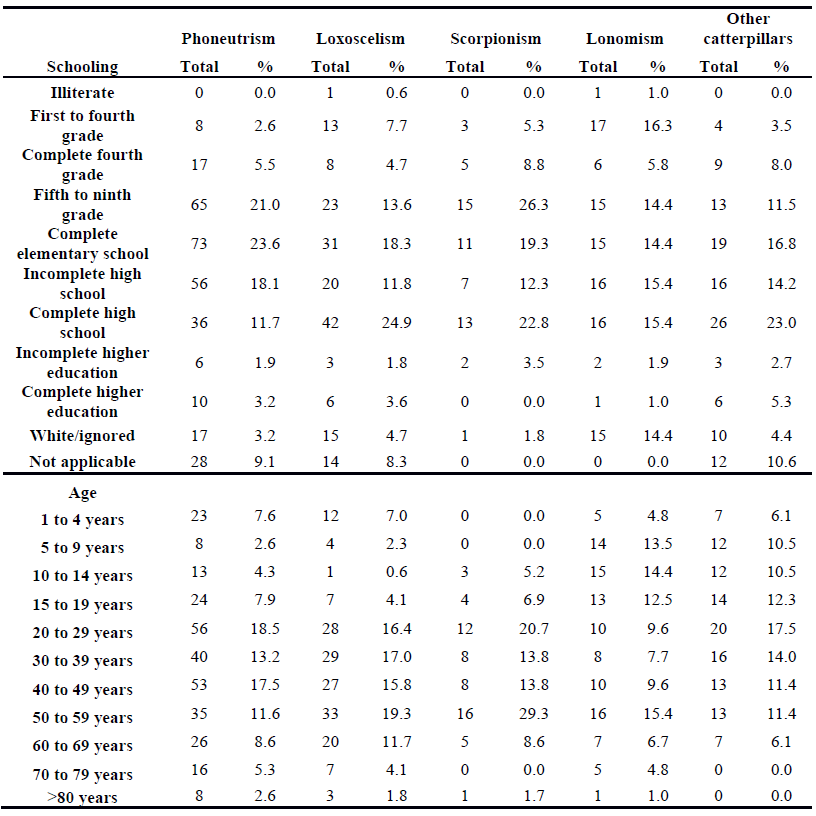 The smaller differentiation in the number of cases between residence areas (urban and rural) only for scorpionism and lonomism may be the result from deforestation and urbanization, supporting the occurrence of these types of accidents.18 In the urban perimeter, city lighting attracts moths for egg laying on trees, mainly fruit trees, which represent sources of food for caterpillars of L. obliqua and favors the occurrence of accidents.18 Similarly, irregular occupation of areas contributes to the precarious conditions of housing, a poor waste collection system eventually allows for the accumulation of this and provides a suitable environment for the proliferation of scorpions, since they find shelter and a source of food that comes from the insects that proliferate in these sites.2 In the rural area, the use of pesticides, the elimination of natural enemies and the adaptation of larvae to exotic plants are factors favoring an increase in the number of accidents involving stinging caterpillars.18