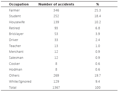 Most of the accidents affected farmers, students and housewives, whose sum accounted for 53.9% of the total number of notifications (Table 3), demonstrating the profile of activity most prone to this type of accident.
