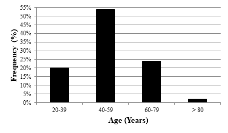 Regarding demographic factors (Table 1), of the 227 patients analyzed, no significant difference was detected between gender and H. pylori infection (p=0.37). On the other hand, a statistically significant relation was observed between the presence of H. pylori infection and patient age (p=0.04), the average was 53.4±13.9 years old with a range of 20–88 years. Figure 1 shows H. pylori infection according to different age groups. The frequency of H. pylori infection increased with age until the age range of 40–59 years, whereas soon after the frequency decreased. This may be associated with a birth cohort effect (i.e. a change in the rate of infection during childhood). Once H. pylori infection is acquired during childhood, and left unidentified and untreated, it can remain for the entire life, leading to the development of gastric disorders.5