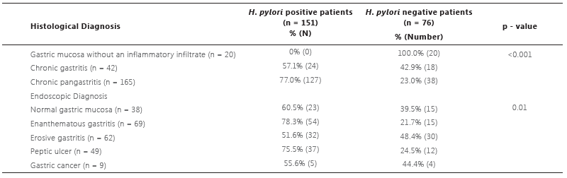 As show in Table 2, a statistically significant association was found between the histological and endoscopic diagnoses as well as the H. pylori infection (p<0.05). According to histological reports, none of the patients infected with H. pylori presented gastric mucosa without an inflammatory infiltrate; and chronic pangastritis was identified in 77.0% of H. pylori positive patients. Based on endoscopic reports, enanthematous gastritis and peptic ulcer were the most frequent diagnoses in patients infected with the bacterium, appearing in 78.3% and 75.5% of patients, respectively. The high frequency of peptic ulcer related to H. pylori identified in this study suggests a low influence of acetylsalicylic acid, non-steroid anti-inflammatories and alcohol on the peptic ulcer development of these patients.8 Furthermore, 55.6% of the patients with gastric cancer were diagnosed with H. pylori. As gastric cancer is a multifactorial disease, environmental factors and host-related variables can be involved in the development of the gastric cancer detected in the patients of this survey.9 However, it is important to note that during atrophic gastritis, intestinal metaplasia and dysplasia, which are disorders that precede the development of gastric cancer, there is a significant decrease in the H. pylori colonization of the gastric mucosa, which could have led to false negative results in the patients with gastric cancer.10