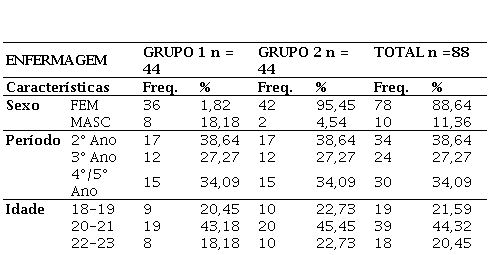 Trata-se de um estudo do tipo qualitativo e quantitativo, realizado no período de 2011 a 2012. Os dados foram coletados no período de agosto a dezembro de em 2011, junto aos acadêmicos do curso de graduação em enfermagem distribuídos em dois campi (dois cursos) localizados em diferentes municípios de uma Universidade Estadual do Paraná. Foram incluídos no estudo acadêmicos do segundo ao quinto ano de curso e que aceitaram participar do estudo. A amostra do Campus 1 (GRUPO 1) com 44 discentes e a amostra do Campus 2 (GRUPO 2) com 44 discentes, totalizando 88 acadêmicos.
