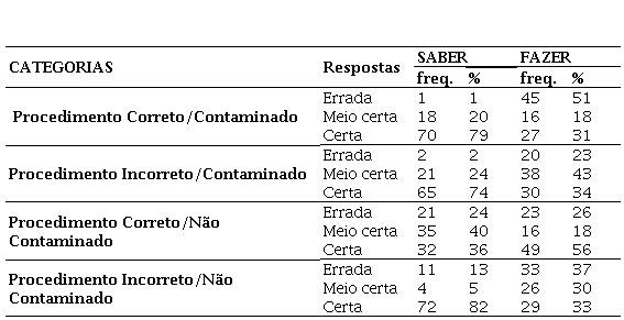 Na categoria de procedimento correto/não contaminado, os acadêmicos não souberam com precisão a conduta certa a ser adotada, tanto que optaram pela conduta meia certa frente ao acidente, mas na hora de indicar o que o profissional realmente faria, escolheram a alternativa correta. Dado que da mesma forma indica inconsistência entre o saber e o fazer. A experiência de passar por um acidente envolvendo material biológico potencialmente contaminado é algo extremamente individual e, provavelmente, cada profissional adotará comportamentos e condutas diferenciadas considerando-se um mesmo tipo de acidente, nas mesmas condições.7,17 Em um estudo sobre o dizer e fazer na prática de exercícios físicos em portadores de diabetes mellitus, com o objetivo de identificar as variáveis que interferem na prática de exercícios como parte do tratamento da doença, encontraram casos em que o participante não apresentava nenhuma correspondência verbal, ou seja, o que ele dizia fazer em relação ao exercício físico não era o que ele realmente fazia na prática.14