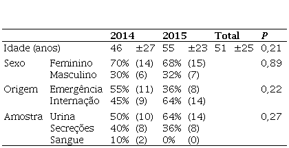 Entre janeiro de 2014 e dezembro de 2015 ocorreram 42 isolamentos de Klebsiella spp. sendo 29 (69%) isoladas em mulheres e 13 (31%) em homens, com idades entre 7 até 91 anos (51 ±25). Os isolados foram obtidos de culturas do trato urinário (57%), seguido de secreções (38%) e infecções da corrente sanguínea (5%). A tabela 1 apresenta as características da população estudada nos dois anos.