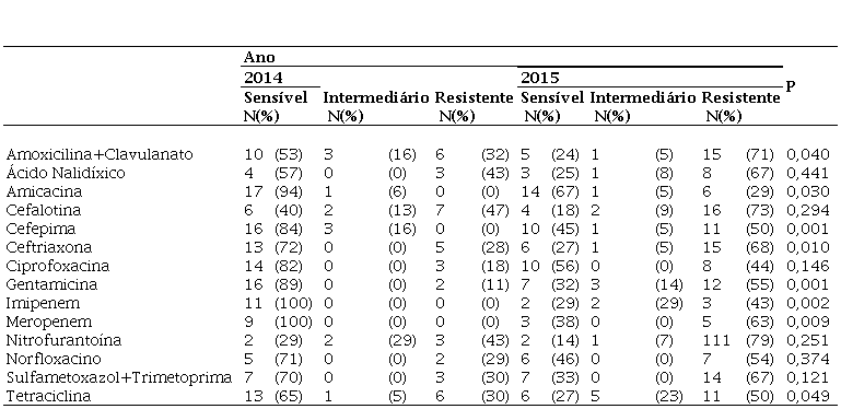 Antimicrobianos como as sulfonamidas e a nitrofurantoína são recomendadas para o tratamento de infecções do trato urinário não complicadas.27 O que é notável em nossa amostragem, com elevada proporção de isolados obtidos de urinas em ambos os períodos, é a ausência de variação estatística na sensibilidade para estes fármacos (P=0,121 para sulfametoxazol+trimetropim, e P=0,251 para nitrofurantoína). Porém, os percentuais de resistência para às duas classes de antimicrobianos se mantiveram elevados, sendo para nitrofurantoína observado o maior percentual de resistência entre todos os antimicrobianos testados (79% em 2015).