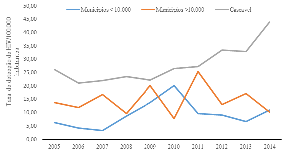 No ano de 2005, os municípios com população menor/igual a 10.000 habitantes apresentaram taxa de detecção por 100.000 habitantes de 6,39, alcançando em 2010 uma taxa de 20,19 e caindo para 11,02 em 2014. Os municípios com população superior a 10.000 habitantes, no ano de 2005 apresentaram taxa de 13,79, 7,95 em 2010 e 10,29 por 100.000 habitantes em 2014. Já o município de Cascavel, entre 2005 a 2010, a taxa de detecção de HIV era de 26,24 e 26,55 casos por 100.000 habitantes, respectivamente. No entanto, no ano de 2014 a taxa subiu para 43,98 por 100.000 habitantes (p<0,05) (Figura 1).