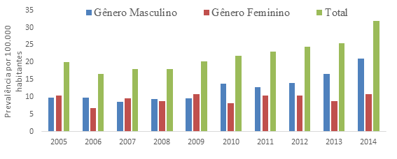 A taxa de detecção do HIV na 10. RS-PR, calculada por 100.000 habitantes entre os anos de 2005 a 2014, reportou um aumento no número de casos da infecção na população (20,06 casos em 2005 e 31,87 casos em 2014). Verificou-se um crescimento de 9,72 em 2005 para 21,06 em 2014 por 100.000 habitantes, para os homens, enquanto que para as mulheres, a taxa se manteve praticamente constante (10,34 em 2005 para 10,81 em 2014) (Figura 2).